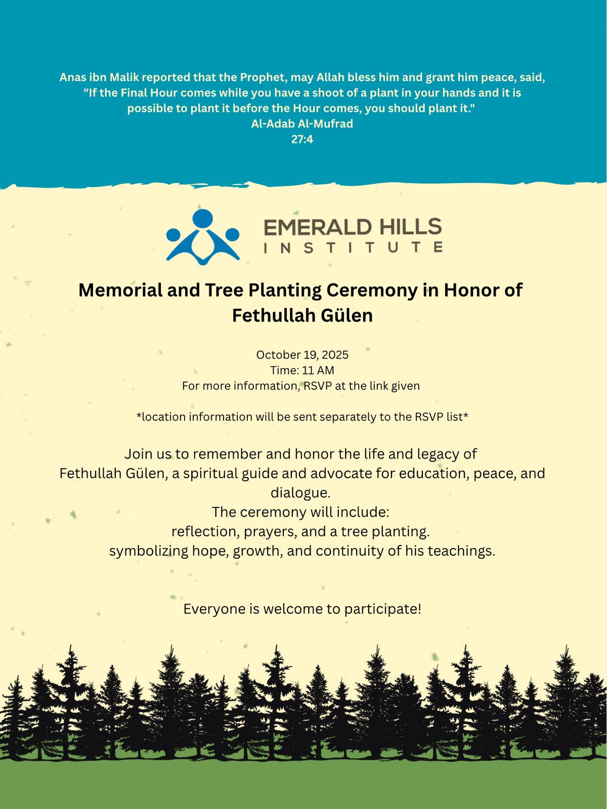 Join us as we commemorate the first anniversary of the passing of Fethullah Gülen — a spiritual guide and advocate for education, peace, and dialogue. The ceremony will include reflection, prayers, and a tree planting, symbolizing hope, growth, and the continuity of his teachings. 📅 Date: Sunday, October 19 🕕 Time: 11 AM Location info...