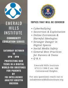 Dear Friends, Emerald Hills Institute invites you to an important session in our Community Education Series: Protecting Our Teens in a Digital World: FBI Briefings for Parents 📅 Saturday, October